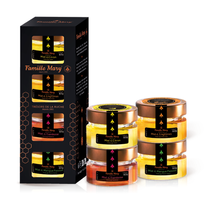 Un lot de miels premiums. Des miels subtils et raffinés à la texture liquide parfaits pour des moments culinaires inoubliables. Composez votre coffret garni de 4 pots de miels édition premium de 60g. Des créations exclusives, où la finesse d’un grand miel d’Acacia s’associe à des extraits naturels rares et à la délicatesse des huiles essentielles. Miel & 3 agrumes, Miel & Citron, Miel & Framboise, Miel & Mangue et fruit de la passion : à vous de choisir.